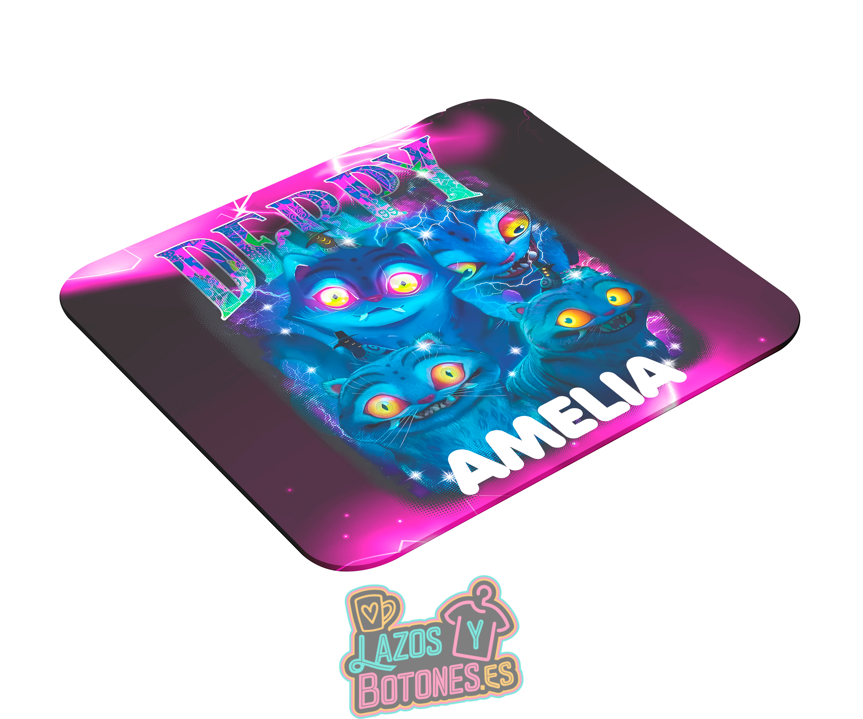 Alfombrilla de ratón personalizada con nombre – Mod. Drippy Cats. Superficie suave, base antideslizante y diseño llamativo en tonos neón.
