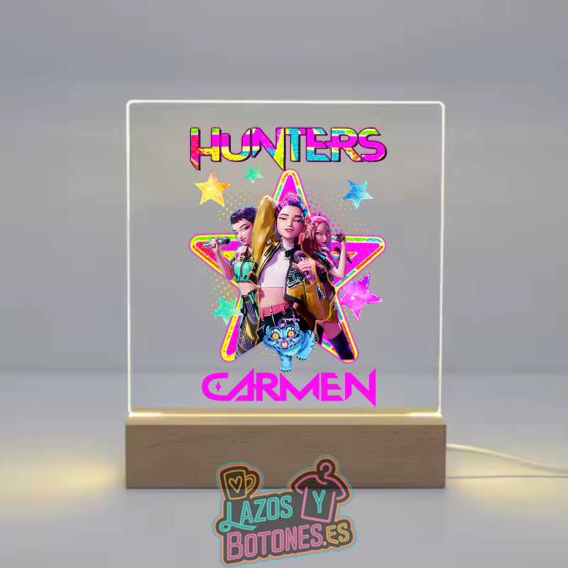 Ilumina la habitación con esta lámpara LED acrílica personalizada Mod. Hunters, un diseño vibrante y lleno de color perfecto para fans del universo Kpop, Hunters y personajes futuristas.