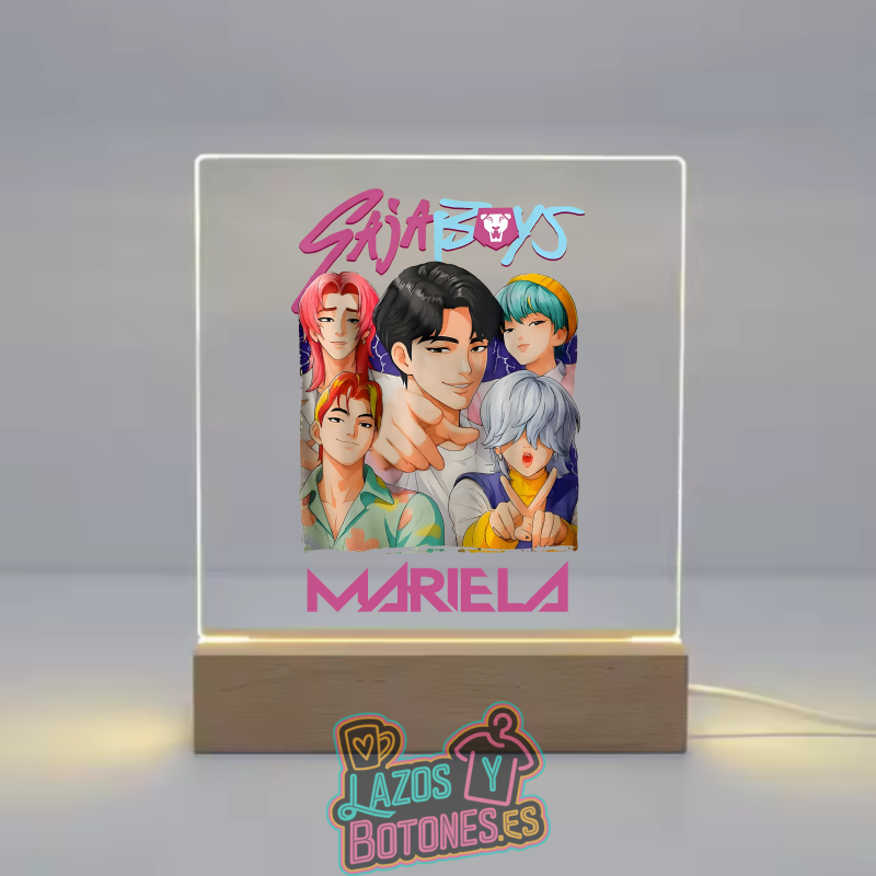 Lámpara LED acrílica personalizada con diseño Saja Boys y nombre opcional. Luz ambiente, base de madera, impresión nítida y fabricación artesanal.