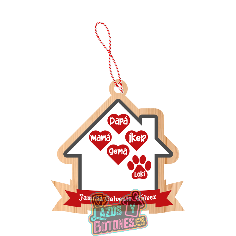 La Bola de Navidad - Mod. Casa Familia reúne a todos en el árbol: incluye la banda con el apellido de la familia, corazones con los nombres y, si lo deseas, la huella de la mascota con su nombre.