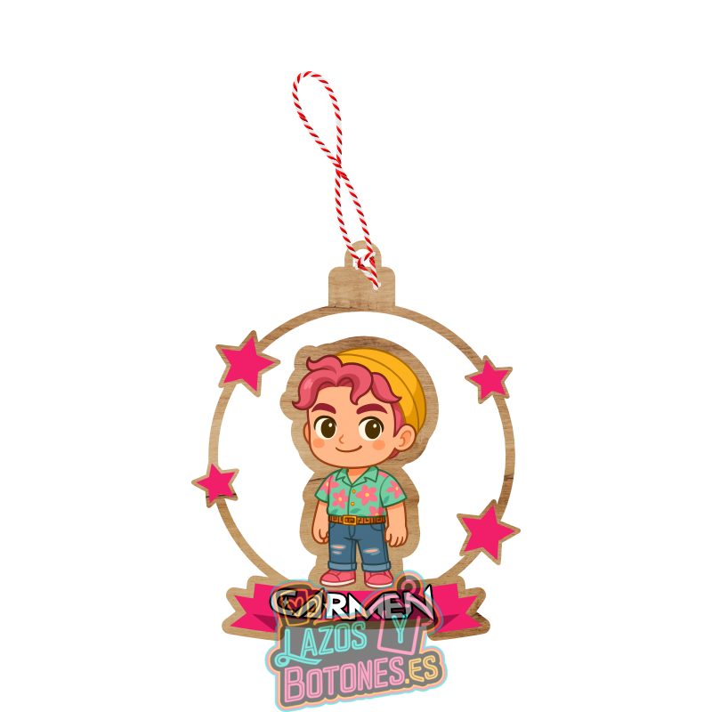 Bola de Navidad de madera inspirada en Abby, integrante del grupo Saja Boys de la saga Demon Hunter / Huntrix. Personalízala con el nombre que prefieras y añade un toque divertido y original a tu árbol con este diseño inspirado en los ídolos más queridos de la película.