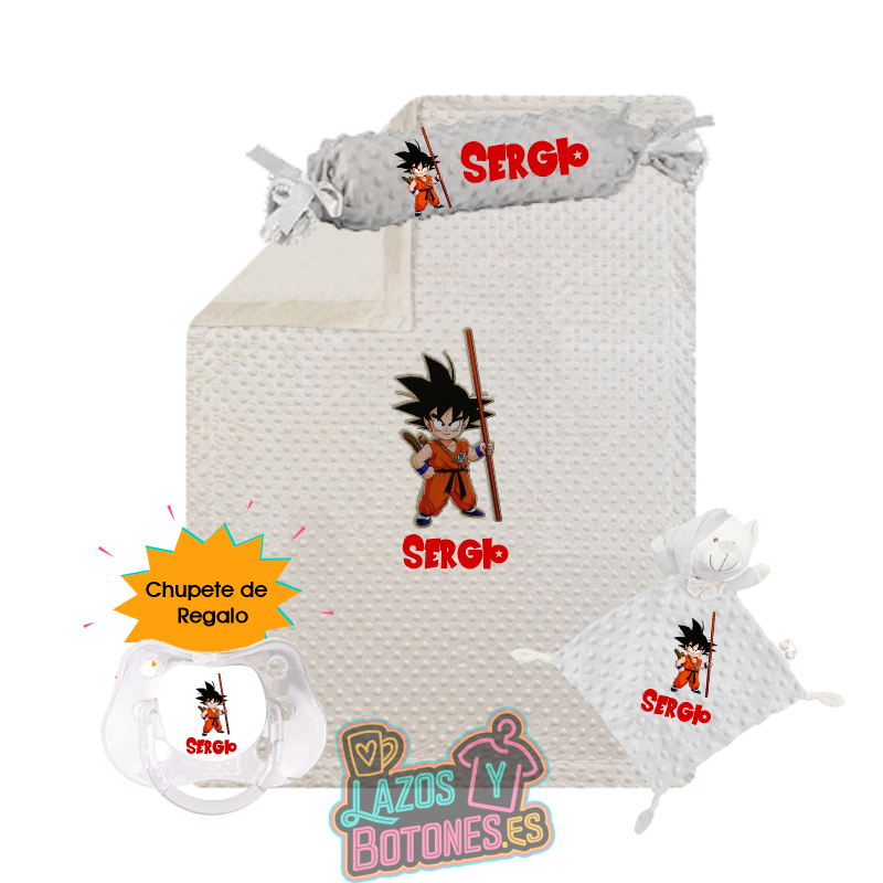 Manta burbujas bordada con el nombre del bebé y el personaje del modelo Goku.