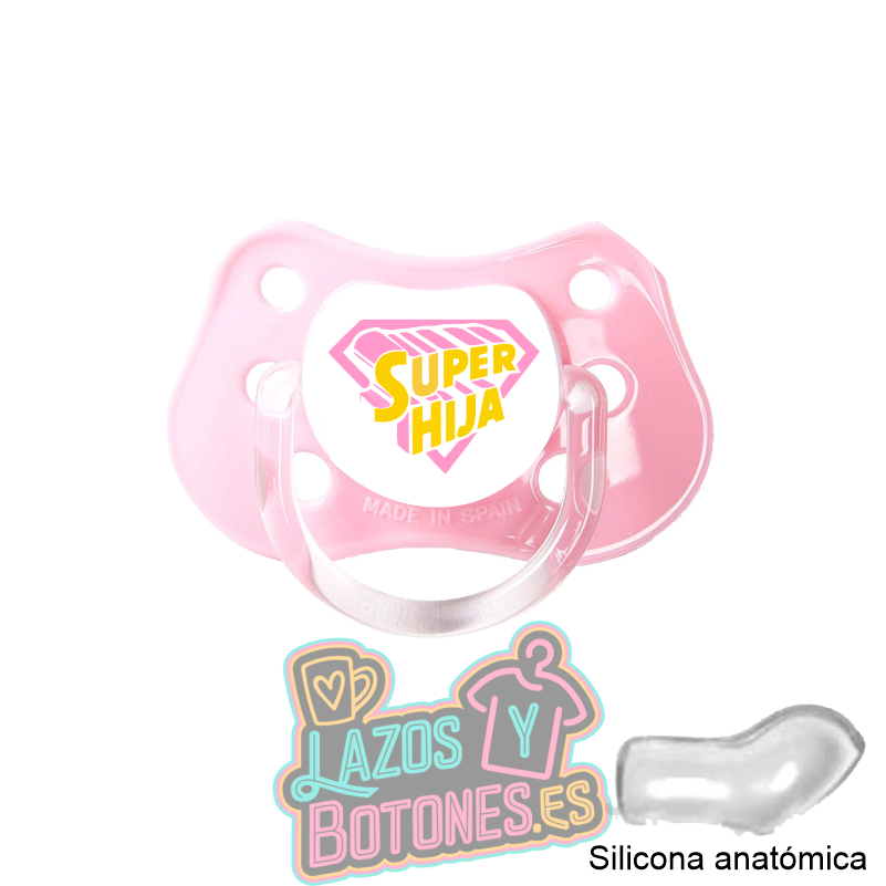 Tu hija es única, especial y una verdadera heroína en casa. El chupete Súper Hija es el complemento perfecto para que tu pequeña luzca su poder y ternura desde los primeros meses. Con un diseño en color rosa y el emblema de Súper Hija, este chupete es ideal para destacar la fuerza y el amor que transmite la peque de la familia.