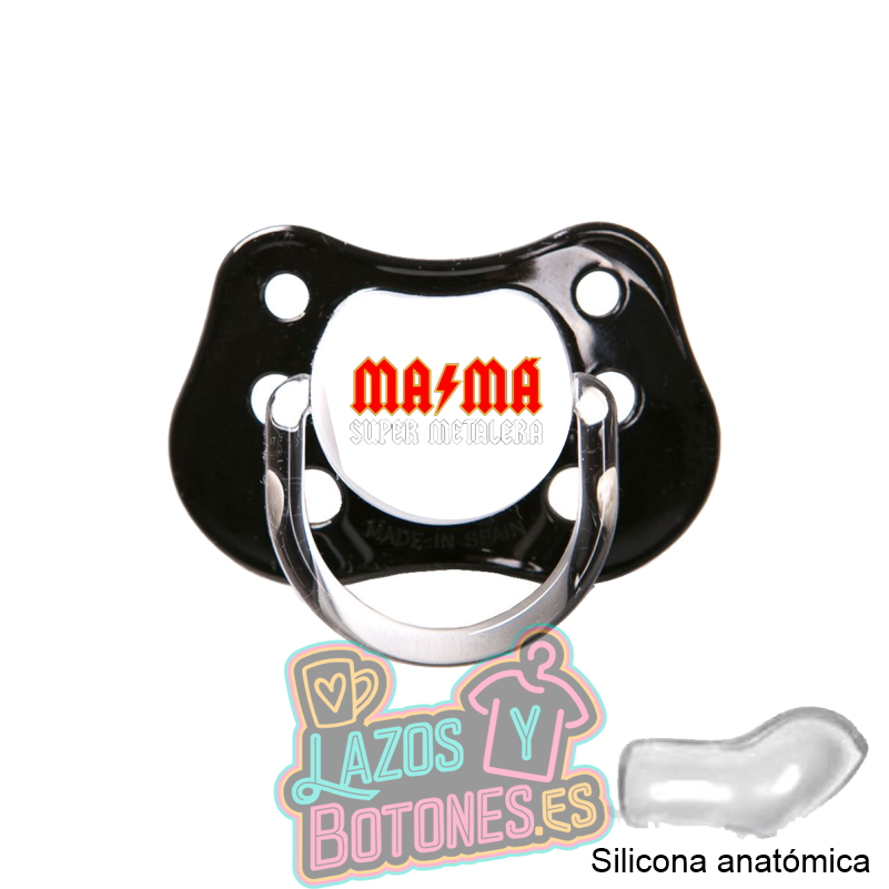 Si eres una mamá súper metalera, este chupete negro con diseño heavy metal es perfecto para tu pequeño. Fabricado en España, con tetina de silicona anatómica para el máximo confort del bebé.