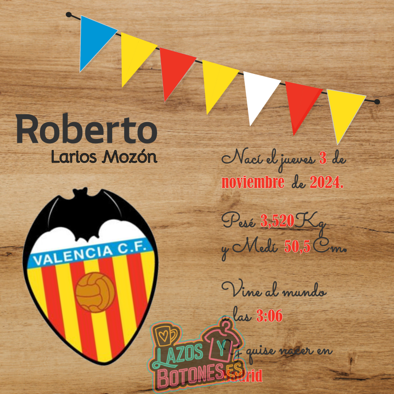 Cuadro de nacimiento personalizado en madera de Tierra de Pinares, Mod Valencia CF estilo banderines. Diseño propio, fabricado en nuestras instalaciones y personalizable con todos los datos del bebé.