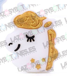 Figura para chupeteros UNICORNIO GOLD 23*28MM alimentaria libre de BPA u otros agentes nocivos. Cumplen con las normativas europeas vigentes. Especialmente diseñados para la elaboración de juguetes infantiles.