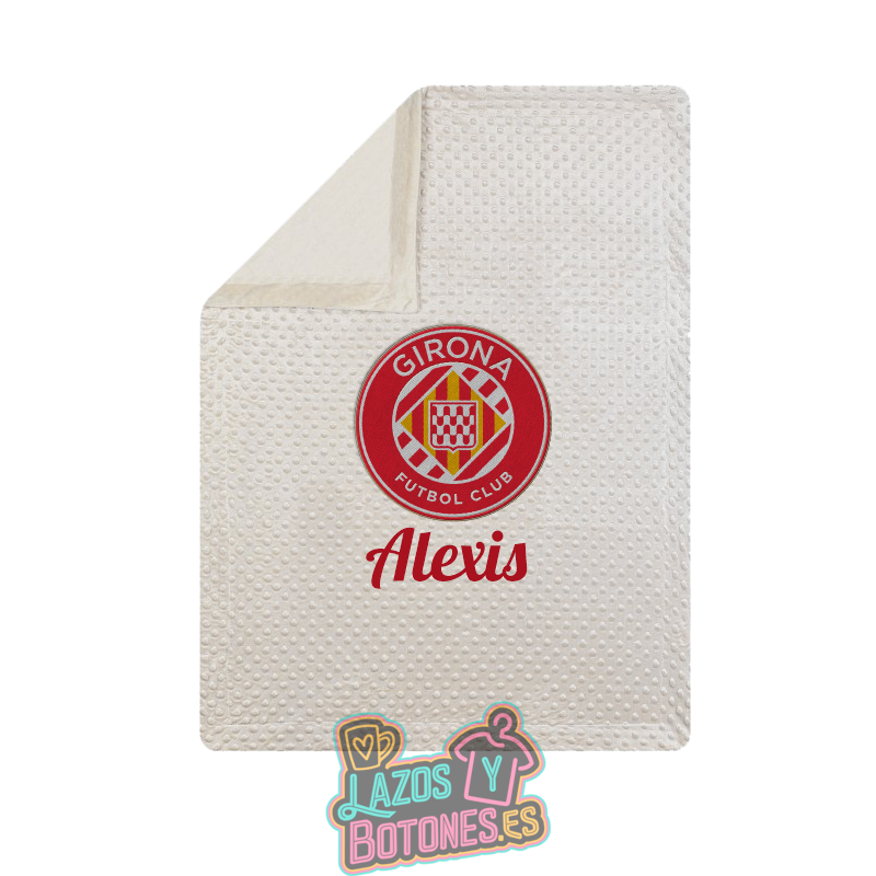 Manta burbujas bordada con el escudo del Girona F.C. y el nombre del peque, elaborada con bordado artesanal para conseguir un acabado resistente, limpio y muy vistoso. Es perfecta como manta de uso diario o como regalo especial para cualquier familia rojiblanca.