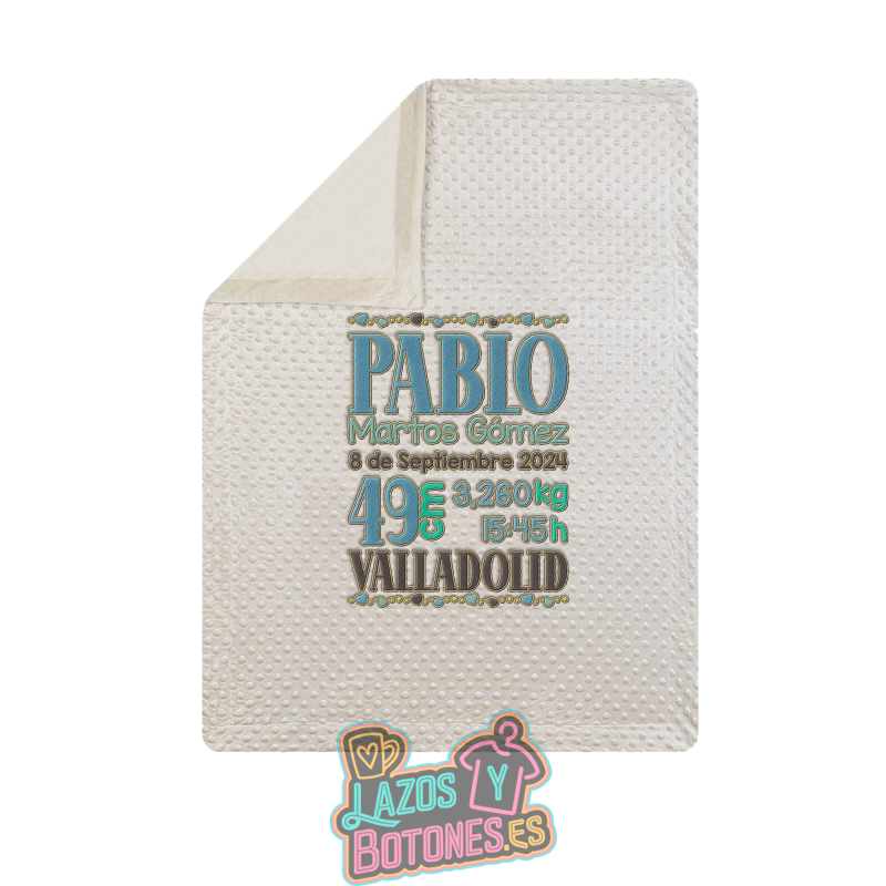 Manta burbujas bordada modelo Natalicio / Nacimiento, diseñada para convertirse en un recuerdo único y muy especial. Incluye todos los datos importantes del bebé: nombre, apellidos, fecha de nacimiento, peso, altura, hora y lugar. Es un detalle perfecto para regalar y una pieza que las familias conservan para siempre.
