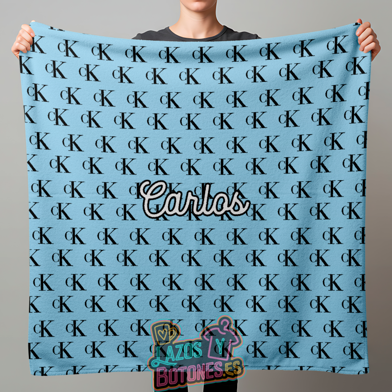 Manta polar personalizada con un diseño moderno de Ck en negro sobre fondo azul. Un estilo urbano y actual, perfecto para peques, adolescentes o adultos que buscan una manta con personalidad.