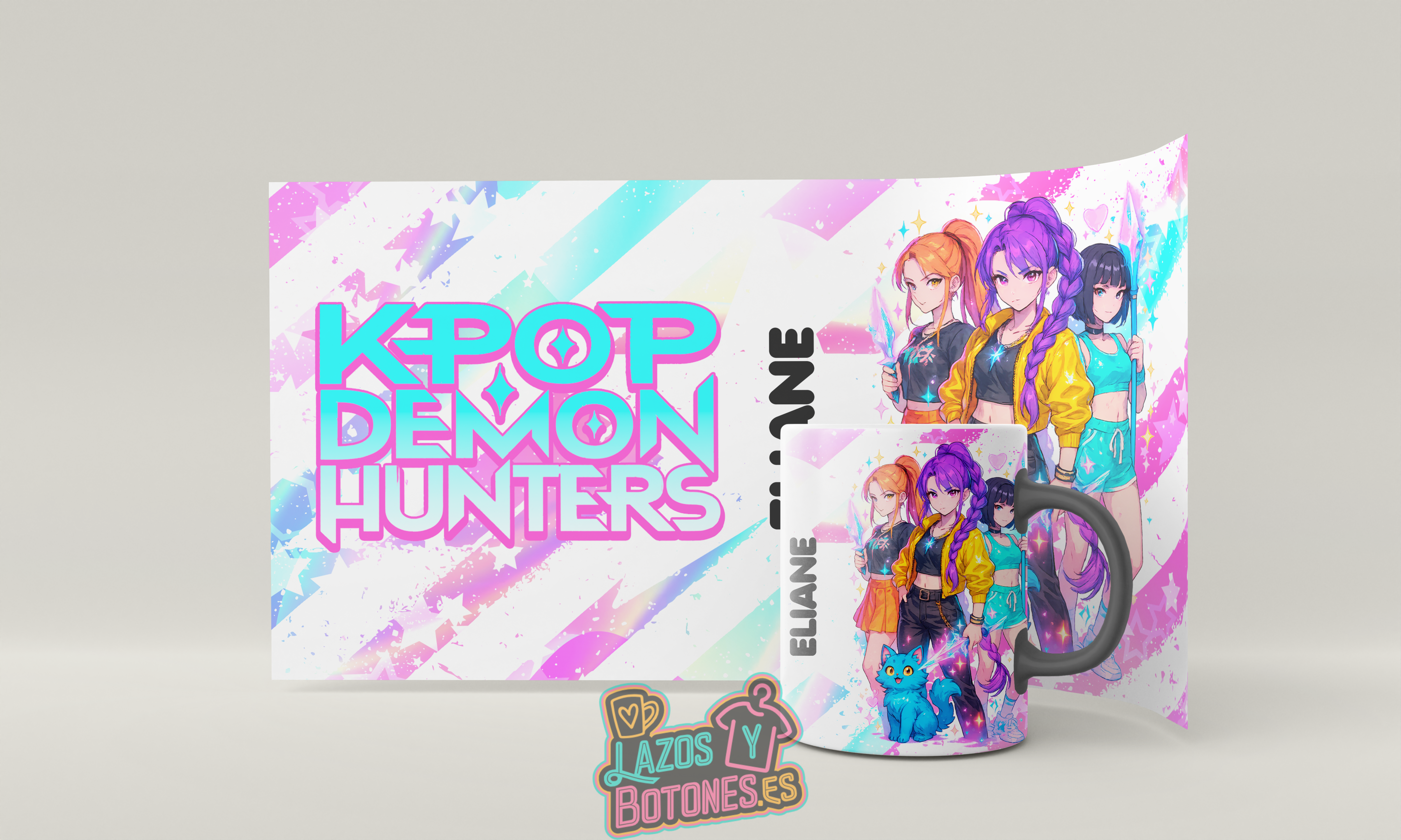 Taza personalizada con el trío Huntrix y gatete en estilo K-pop sobre fondo pastel con salpicaduras. 350 ml, acabado brillante y nombre incluido.