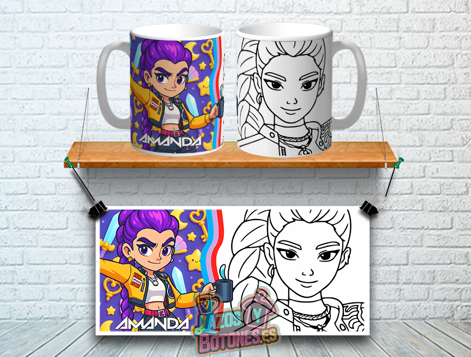 Taza personalizada inspirada en Huntrix, con un lado impreso a color y otro para colorear. Ideal para regalar o disfrutar pintándola con rotuladores acrílicos.