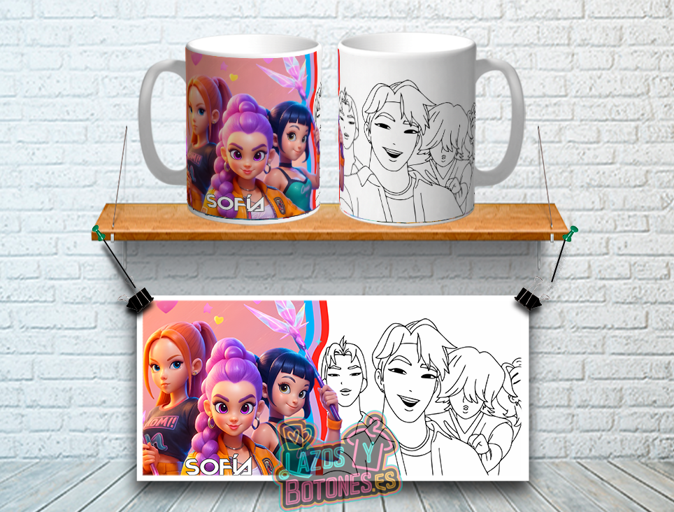 Taza personalizada inspirada en Huntrix, con un lado impreso a color y otro para colorear. Ideal para regalar o disfrutar pintándola con rotuladores acrílicos.