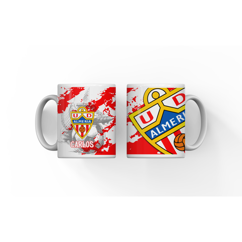 Taza de cerámica premium con diseño del UD Almería. Personalízala con tu nombre y recibe una vista previa antes de producir. Apta para microondas y lavavajillas.